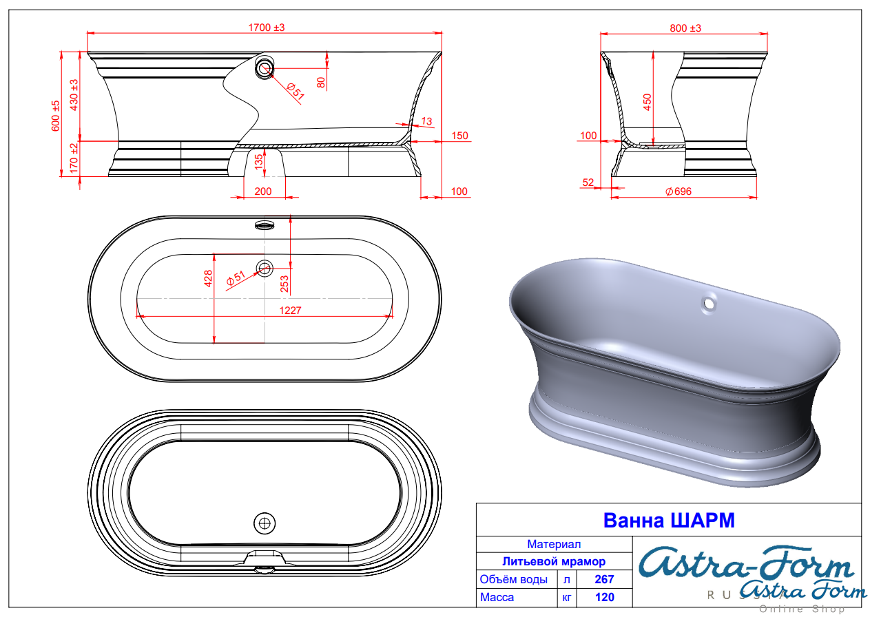 Размер: Длина/Ширина170/80 см.Типотдельно стоящаяВысота60 смГлубина ванны45 смОбъем267 лВес120 кгСтрана изготовленияРоссия