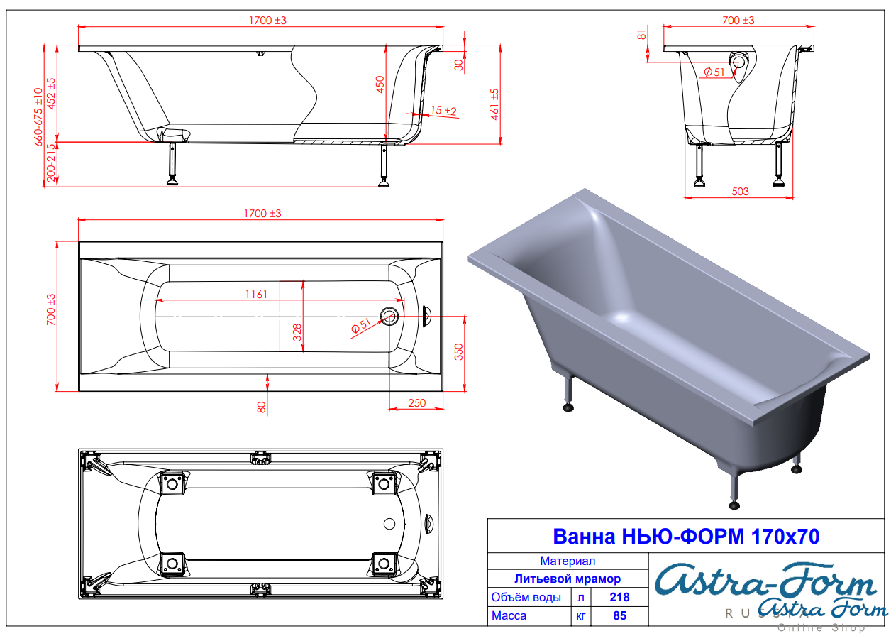 Ванна Astra-Form Нью-Форм Solid Surface 170/70 см