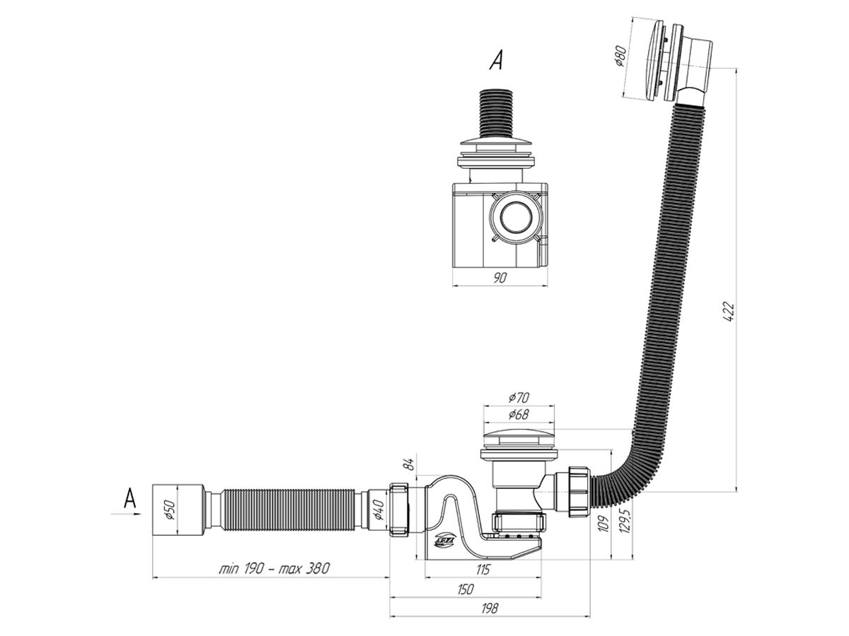 • Сифон сливной ANI PLAST click-clack для ванны с выпуском "клик-клак", с грибком-сеткой и переливом.