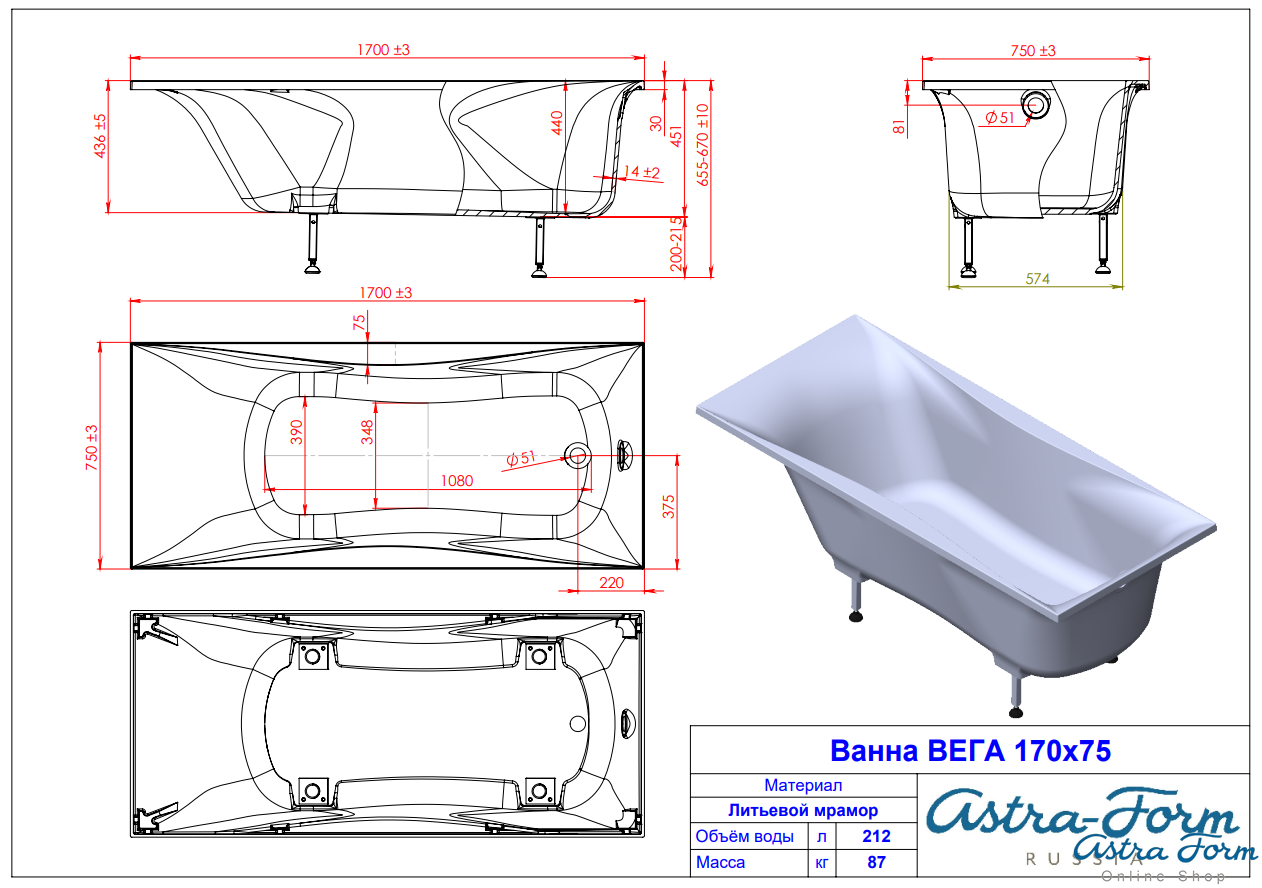 Astra-Form ванна Вега Solid Surface 170/75 см белая матовая